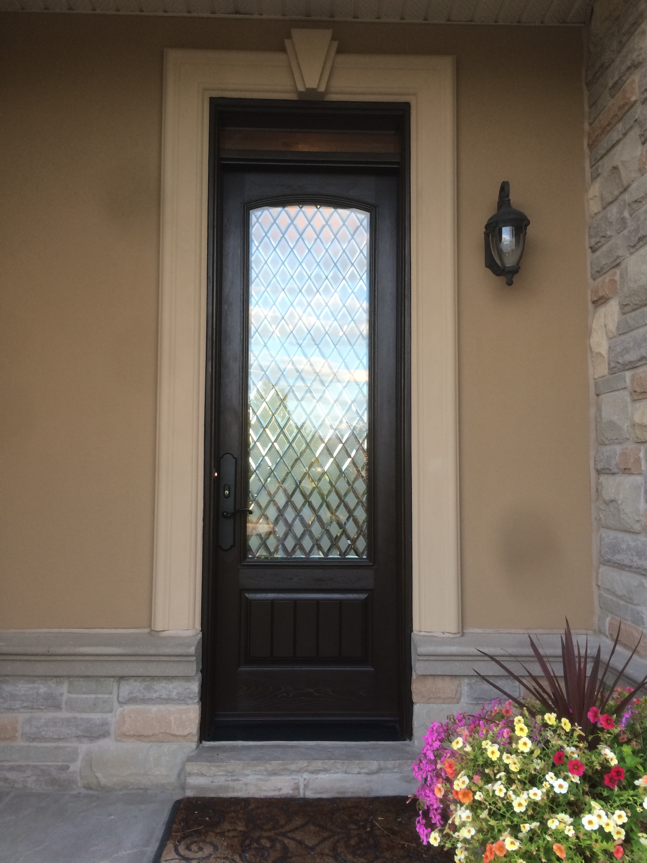Custom 8ft Mastergrain door with 2 sidelites and transom sidelites with sandblasted leaded glass in Mocha colour