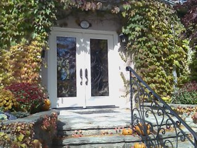 8ft Mastergrain Fiberglass door with beautiful sandblasted canterbury leaded glass
