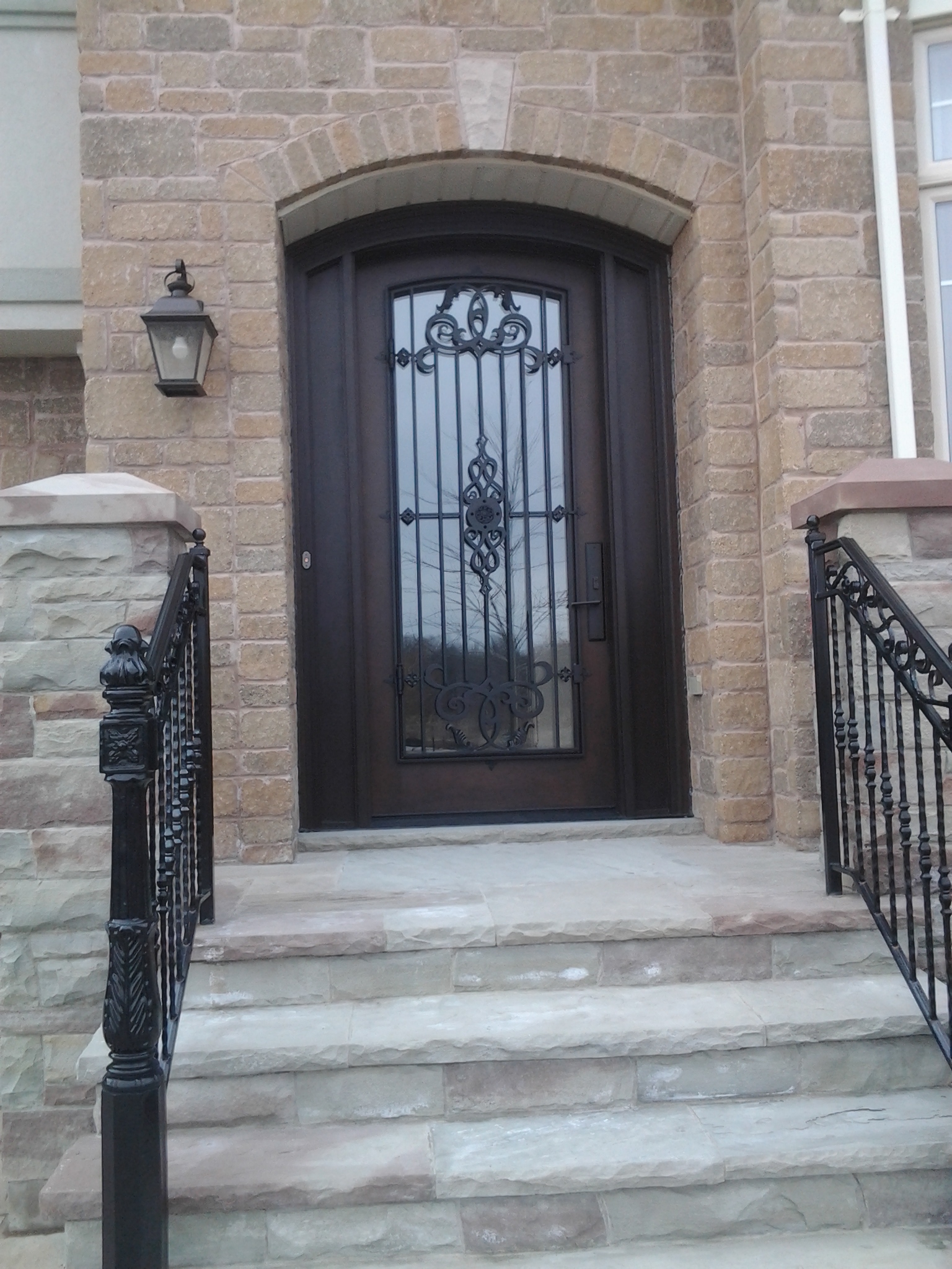 Custom Mastergrain Fiberglass door with Miliano Millenia Wrought iron Design