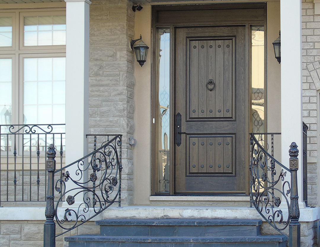 Mastergrain Fiberglass 42 Inch door with Panel Sidelites and wrought Iron transom
